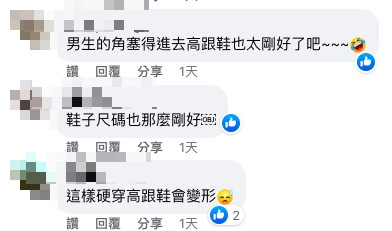 然而,卻有不少人歪樓,直言「如何穿下去的?厲害」、「女生的腳是多大?竟然男生穿得下」、「男生的角塞得進去高跟鞋,也太剛好了吧」、「鞋子尺碼也那麼剛好」、「這樣硬穿高跟鞋會變形」、「是女生腳太大還是男生腳太小?居然能交換穿」。若你是原PO,會不會替男友+100分呢?