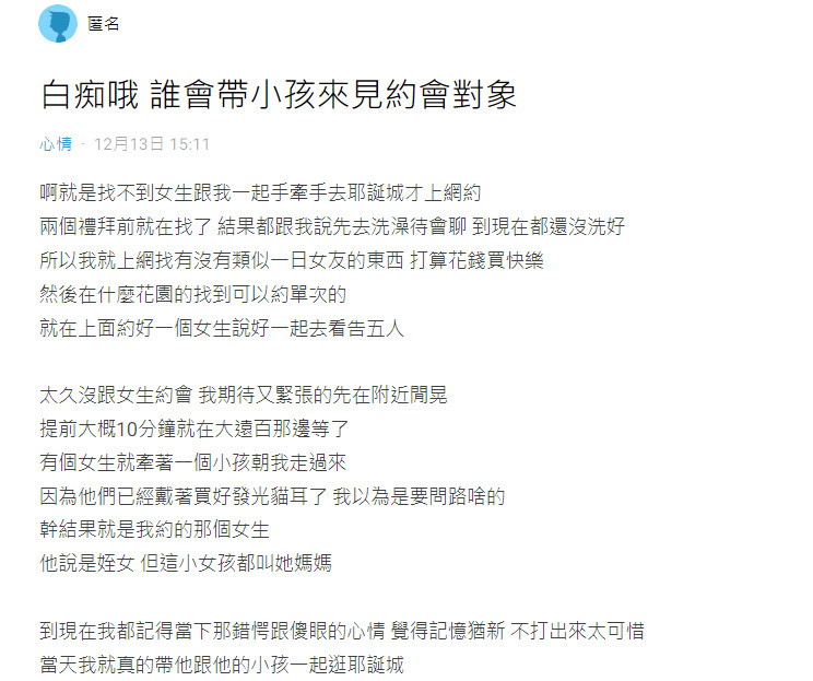 來自台東的男卡友在Dcard心情版上投訴糟糕的交易經驗。原PO希望能和漂亮女生同遊情侶聖地耶誕城,無奈身邊沒有對象,於是從2週前就開始上網尋覓一日女友服務。恰好在網路上找到接受單次約會的24歲正妹,兩人約好一起去聽耶誕城演唱會。