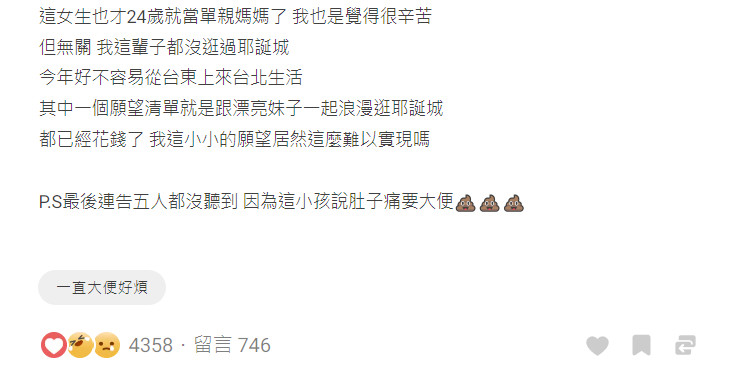 不過錢都花了,看對方單親辛苦也不好意思要求退費,原PO只好認命和這對母女一起逛耶誕城。不幸中的更不幸是,小孩一路上喊累吵回家又頻頻想上廁所,讓原PO怒火中燒:「一點浪漫戀愛的感覺都沒有!」原PO人生中第一次逛耶誕城就這麼莫名其妙結束了,「最後連告五人都沒聽到,因為這小孩說肚子痛要大便」,質疑為何花錢也無法實現小小願望。