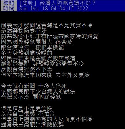 原PO看這幾日新聞報導已經有多人因為低溫猝死,不過「依照鄉民跟不少台灣人的說法,台灣又不冷、開個屁暖氣?」,他覺得這似乎和台灣人「以為自己很勇、不怕冷」的觀念有關,很多嘴上說不怕冷的人,像是是體脂率高、老人家等,反而是高危險族群,忍不住發問「台灣是不是防寒觀念很差,還停留在不怕冷=勇的危險觀念?」