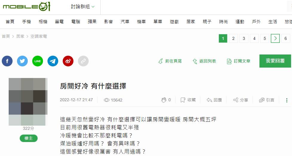 一位住在5坪房間的網友上論壇mobile01發文求解,由於家裡的電熱器又舊又耗電,甚至似乎快要壽終正寢了,原PO詢問:「有什麼選擇可以讓房間變暖暖?冷暖機會比較不那麼耗電嗎?煤油暖爐好用嗎?會有異味嗎?」原PO也猶豫是否再購入一台電暖器。