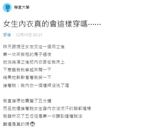 原PO原地震驚5分鐘,不敢相信女友竟然不洗內衣,沒想到對方又透露,「女生穿內衣沒流汗的話都這樣」。他交了5任女友第一次聽到這種說法,不禁疑惑「難道是真的嗎?」