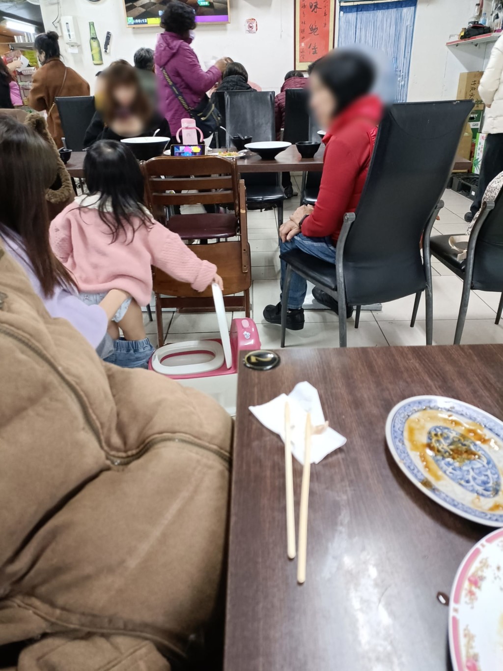 從原PO曬出的兩張照片可以看到,一名穿著紫色上衣的女子,替身穿粉上衣的女童穿脫褲子,一旁狹小的走道就擺著兒童便攜式馬桶,與隔壁桌僅隔著幾公分,食慾明顯會受影響,卻未見身旁長輩阻止,而廁所明明就在正後方。