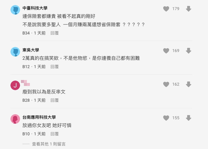 對此,幾乎無人力挺原PO,反而紛紛砲轟,「2萬真的要餓死,還在那邊說什麼女友物慾,她能忍你到現在真心佩服」、「收入2萬她物慾?我都不知道該怎麼回這個文,樓下來講」、「連『小雨衣』都嫌貴,好可憐,我說女朋友」、「很努力才2萬,真的不如去做其他當主業,接案當副業,女朋友真的好可憐」、「拜託2萬別交女朋友了好嗎?別拖累別人的人生」、」物慾不高,性//慾倒挺高」、「先不戰你收入2萬, 打×連『小雨衣』都買不起,這合理嗎?」你認同網友說法嗎?還是同情原PO呢?