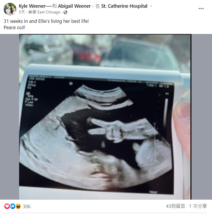 根據外媒《DC News Now》報導,美國印第安納州 (Indiana) 的爸媽凱爾和艾比·維納 (Kyle and Abby Weener) 已經有2個孩子,期待第3個寶貝加入他們的家庭。最近維納夫妻到東芝加哥 (East Chicago) 的聖凱瑟琳醫院 (St. Catherine Hospital) 進行一般產檢,過程本來一如往常,結果艾比肚子裡的寶寶突然給大家驚喜。