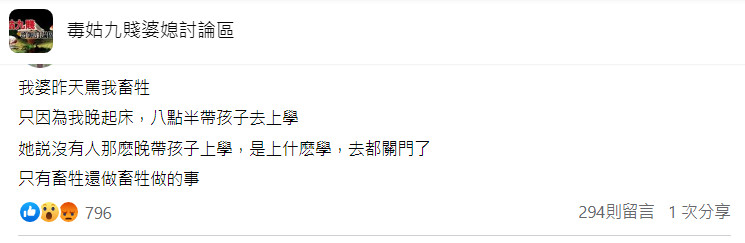 這位媳婦在臉書社團《毒姑九賤婆媳討論區》抒發被婆婆欺負的苦悶。原PO這天睡得比較晚,8點半送孩子去上幼兒園,結果就被婆婆罵,「她說沒有人那麽晚帶孩子上學,是上什麼學,去都關門了,只有畜牲還 (才) 做畜牲做的事」。原PO補充,除了婆婆會不高興,連小叔也認為她應該讓孩子在7點半到校。