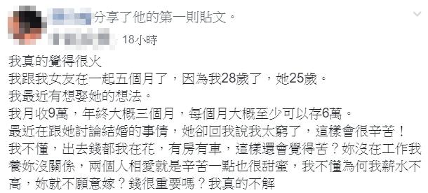 28歲男網友在臉書社團《爆怨公社》宣洩怒氣,他和25歲的女友交往5個月,開始想和對方規劃結婚。原PO表示自己「月薪9萬、年終大概3個月,每個月至少可以存6萬」,除了高薪之外還已經有車有房,討論到未來時女友卻拒絕:「你太窮了,這樣會很辛苦!」