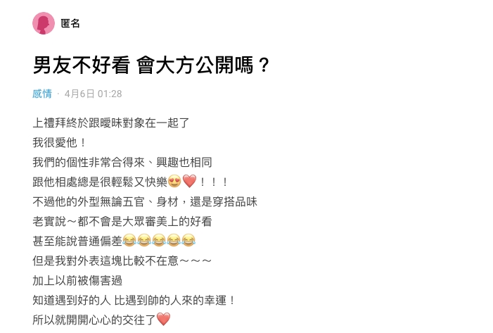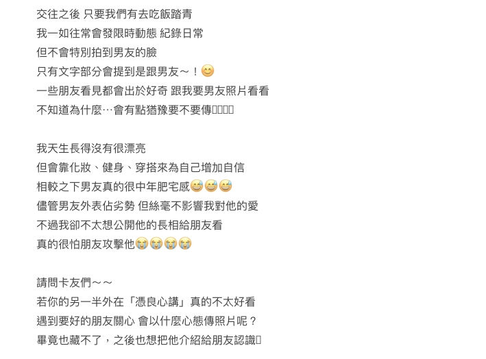 原PO透露,上禮拜跟曖昧對象展開交往,雙方個性合得來、興趣也相同,相處輕鬆又快樂,非常愛他,但男友的外型無論五官、身材,還是穿搭,都不會是大眾審美上的好看,甚至可以說是普通偏差。不過,原PO對外表不在意,加上以前被傷害過,知道遇到好的人,比遇到帥的人更幸運。原PO與男友交往後,只要有出遊,都會發布發限時動,卻不會刻意拍到男友,只會用文字提及,一些朋友看見後,紛紛要求「想看男友的照片」,但不知為何,原PO都會猶豫到底要不要傳。