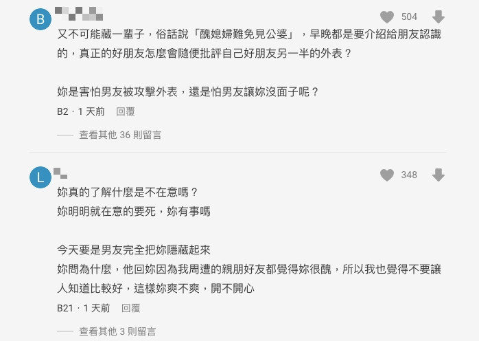 然而,更多人點出貓膩,毫不客氣地說「妳就是在意才會發文詢問」、「妳真的了解什麼是不在意嗎? 妳明明就在意的要死,妳有事嗎?今天要是男友完全把妳隱藏起來,妳問『為什麼?』他回妳『因為我周遭的親朋好友都覺得妳很醜,所以我也覺得不要讓人知道比較好』,這樣妳爽不爽,開不開心?」、「明明就有影響妳對他的愛,不然幹嘛討論?」、「別自欺欺人,其實妳打從一開始就看不起他」。你會給原PO什麼建議呢?支持哪派網友的論點?