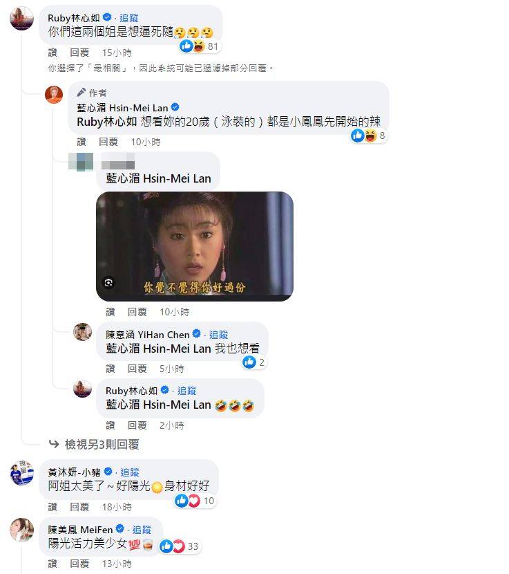 看到藍心湄的泳裝照後,一排藍勾勾藝人們都在底下狂讚:「阿姐太美了~好陽光,身材好好」、「太可愛的臉蛋,好辣的身材」、「天~好均勻好均勻」、「這腿至今依舊 (100分) 」。看完藍心湄和陳美鳳的辣照,女星林心如也留言:「你們這兩個姐是想逼死隨 (誰) 」,藍心湄則是調皮敲碗林心如的20歲泳裝照。如果要論年輕時期的海灘辣照,還有哪位明星讓你最印象深刻呢?
