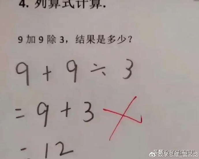 根據《新浪新聞》報導,一位媽媽向網友們求助,兒子正在唸小學三年級,檢查考卷時,發現題目為「9+9÷3」,孩子回答「12 」,卻被老師糾正。網友們看到後,都一致認為「孩子做得沒錯,肯定是老師不小心改錯了!」要媽媽私下問老師。