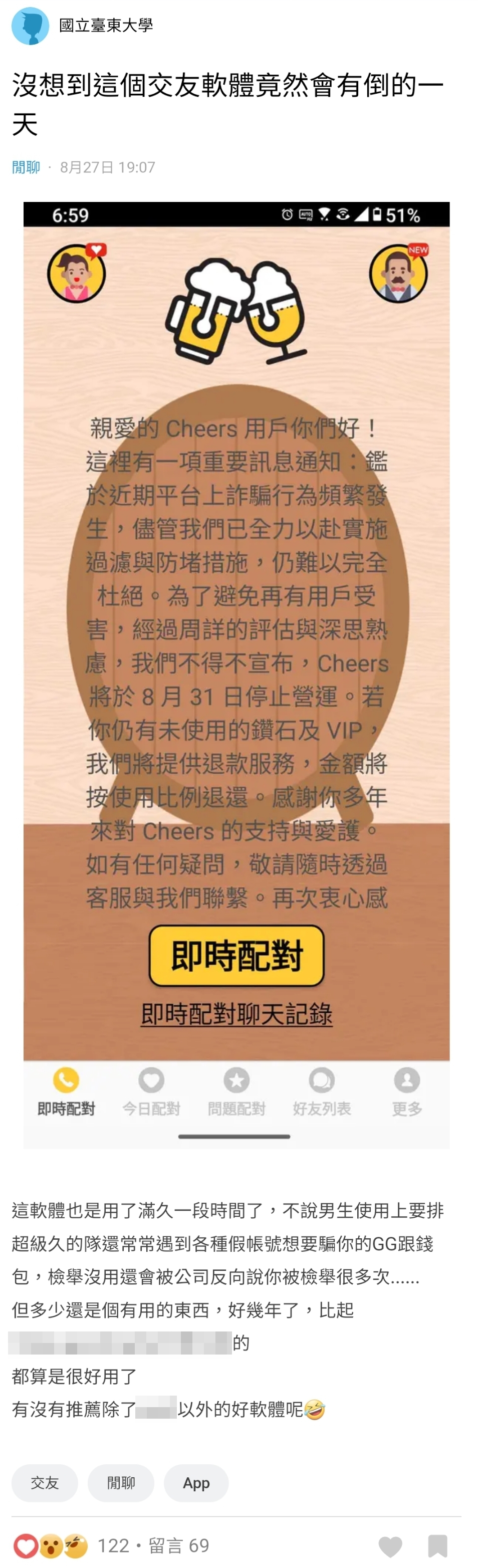 Dcard男卡友在閒聊板上表示:「沒想到這個交友軟體竟然會有倒的一天」。原PO貼出Cheers介面截圖,公告宣布將於8月31日停止營運,若有購買APP內容或是VIP會員,Cheers客服將會協助退款。公告說明「平台上詐騙行為頻繁發生」,APP已經盡力過濾防堵仍難以杜絕,「為了避免再有用戶受害」才不得不宣布停止營運。