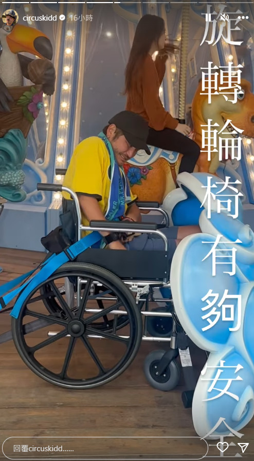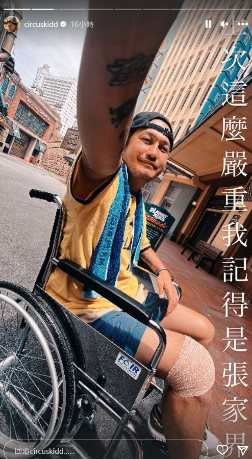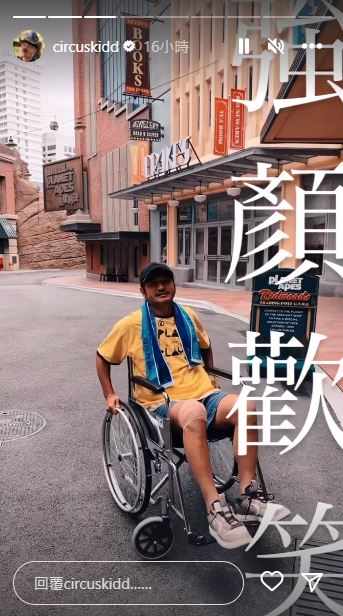 不過天性樂觀的KID就算受傷仍不忘搞笑,在IG現實動態曬出自己坐輪椅的影片,連坐著輪椅還要玩旋轉木馬,自嘲是在強顏歡笑,也透露「上次受這麼重的傷是在張家界」。而他預計今 (8) 日回台再做進一步治療。