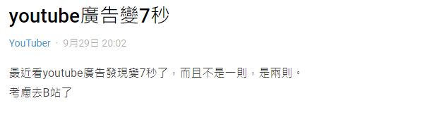一名網友在網路論壇Dcard上發文抱怨,表示最近YouTube上的廣告增長到7秒,一次還連播2則,如此密集的強制推銷,讓他受不了直呼「考慮去B站了」。