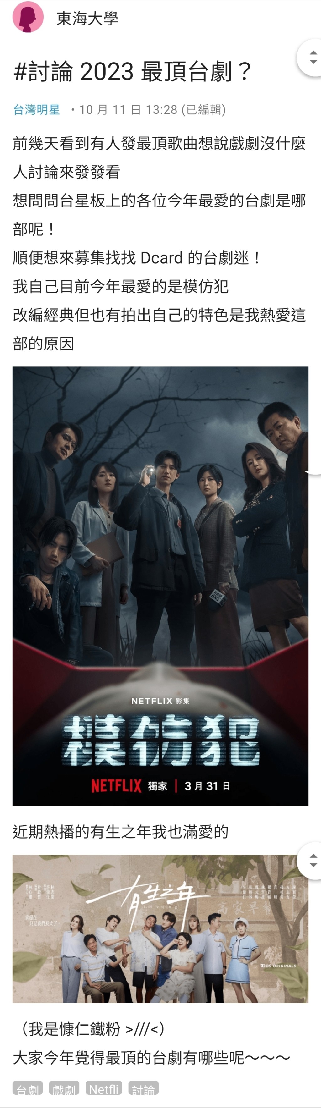 一位女卡友在Dcard台灣明星板發起討論:「想問問台星板上的各位今年最愛的台劇是哪部呢?」原PO本身是演員吳慷仁的鐵粉,把最愛的一票投給3月底播出的《模仿犯》:「改編經典但也有拍出自己的特色是我熱愛這部的原因,近期熱播的《有生之年》我也滿愛的。」