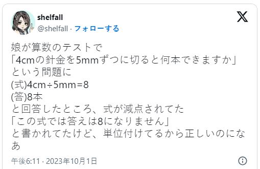 日本一位家長在推特上發問,他就讀小學的女兒近來遇到一道數學題,「將4cm的鐵絲以5mm的長度分著切,最終會切成幾條鐵絲?」女兒寫下算式「4cm÷5mm=8」,得出答案為「8條」,結果卻被老師認為「這樣的算式答案不會是8」而扣分,但他不認為這樣的算法有錯,不懂問題是出在哪?