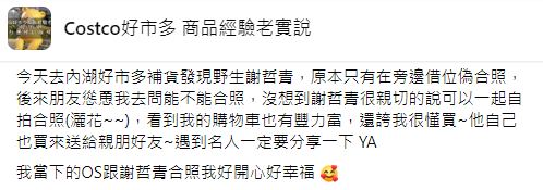 一名網友在臉書社團《Costco好市多 商品經驗老實說》上興奮發文,透露日前她在好市多居然發現野生謝哲青!她原本害羞怕打擾,只敢在一旁借位偽合照,最後在朋友的慫恿下,她鼓起勇氣上前詢問是否可以合照,沒想到謝哲青二話不說答應。