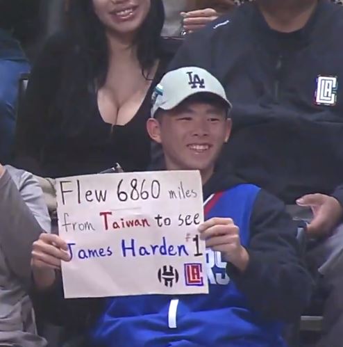 根據媒體《ETtoday運動雲》、《民視新聞網》的報導,17日,洛杉磯快艇隊在主場以128比117戰勝強敵奧克拉荷馬雷霆隊,有趣的是,該場比賽進行到一半時,場邊攝影機捕捉到一位來自台灣的小球迷,手拿著自製海報向球星哈登 (James Harden) 表白。