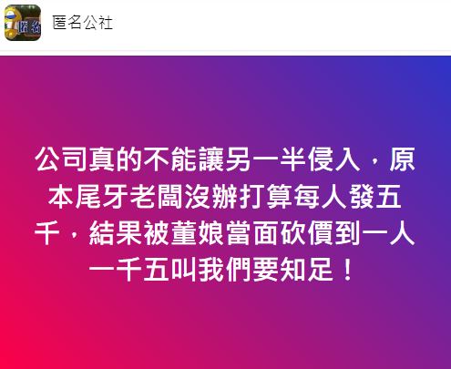 一名網友在臉書社團《匿名公社》上發文抱怨,表示今年公司原本老闆打算不辦尾牙,改發每個人5000元獎金,誰知董娘當面否決這項提議,金額砍價縮水剩1500元,還向員工喊話「要知足」,讓他傻眼直呼「公司真的不能讓另一半侵入」。