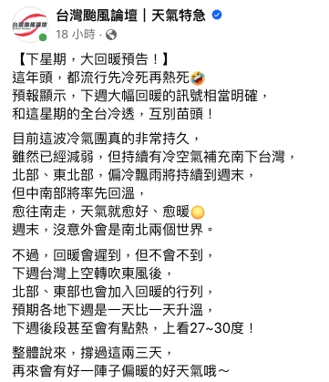 臉書「台灣颱風論壇|天氣特急」指出,「這年頭,都流行先冷死再熱死,下周大幅回暖的訊號相當明確」,預報顯示,北部、東北部目前仍偏冷飄雨,將持續到周末,但中南部將率先回溫,「越往南走,天氣就越好、越暖。」