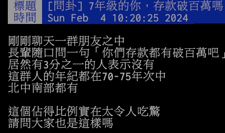 原PO表示,和一群朋友聊天,其中有名長輩隨口問了一句「你們存款都有破百萬吧?」居然有3分之一的人都說「沒有!」這些人的年紀大概都是70至75年次、北中南都有,「這個佔的比例實在太令人吃驚!請問大家也是這樣嗎?」