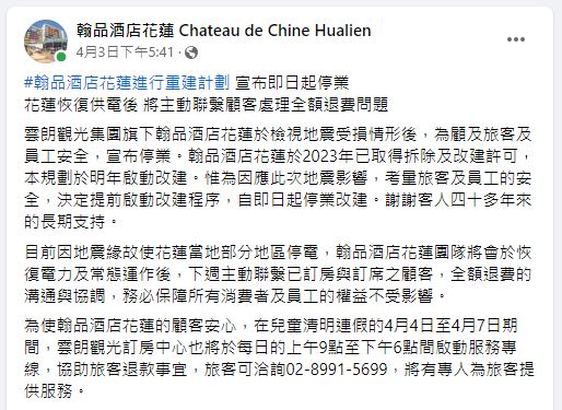 根據《壹蘋新聞網》、《NOWnews今日新聞》報導,4月3日規模7.2強震過後,花蓮翰品酒店不幸也成為受災戶,為了顧及旅客及員工安全,所屬雲朗觀光集團立即宣布停業,並主動聯繫房客和已經訂房的旅客進行全額退款動作。