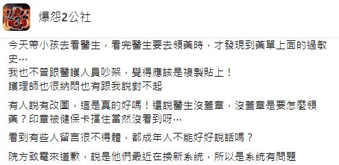 一名網友在臉書社團《爆怨2公社》上分享傻眼經歷,24日她帶著6歲的兒子到衛生福利部基隆醫院看診,拿到藥單後準備要去領藥,卻發現單子上的過敏史一欄,居然被寫上「媽媽是婊X!」她強調自己不曾跟醫護人員吵架,向護理師反映,對方也很納悶,當下有和她道歉,她則推測可能是醫師在打藥名時,不小心複製到其他病患的病歷。