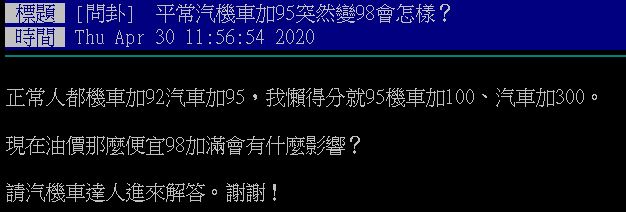 一名網友在網路論壇PTT上發問,大多數的人汽油都是加92或95,相較之下花費比較便宜,但若是遇上油價比較低的時候,好奇「平常汽機車加95突然變98會怎樣?」
