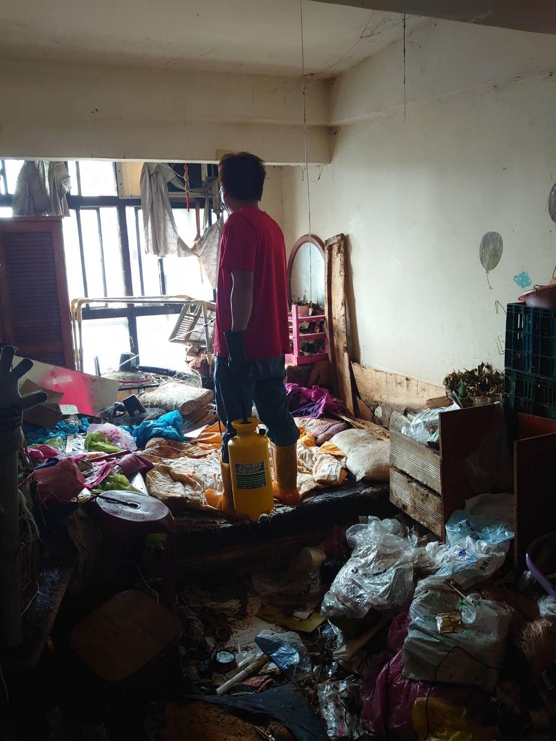 一名手持消毒用品、看似要來打掃的民眾,雖然沒有拍到正臉,但相信已經眼神死了!