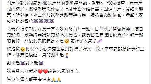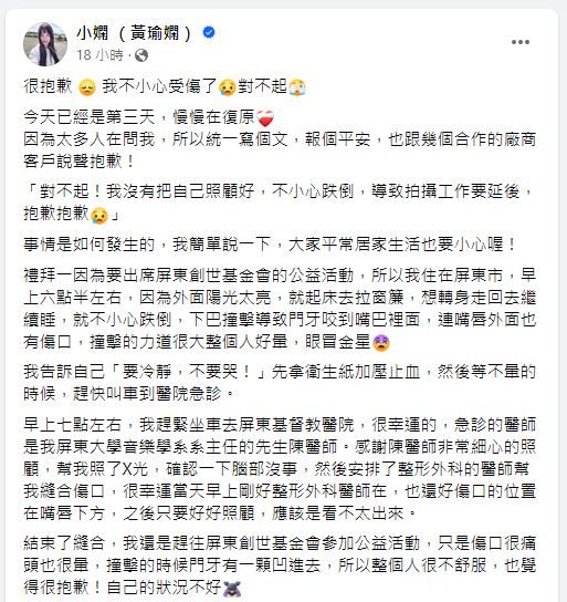 小嫻也曝光傷勢照,透露自己已慢慢在復原,只是嘴唇還很腫、傷口有點繃。因為受傷耽誤工作進度,讓她感到相當愧疚,「很抱歉,我太不小心沒有注意到就跌了好大一跤,本來安排好多事和工作,都要往後延,真的對不起!」