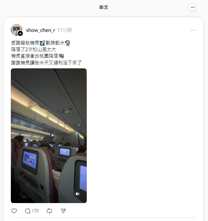 CI221上一位乘客在Threads分享班機降落的機內視角,由於松山機場風太大,降落2次都不順利,最後機長決定「直接衝去桃園降落」。當飛機順利降落桃園機場,窗外的天空仍陰雨綿綿,機內眾多乘客則是非常感動,紛紛拍手感謝機長的聰明決策。原PO表示:「感謝華航機長戰勝凱米!」