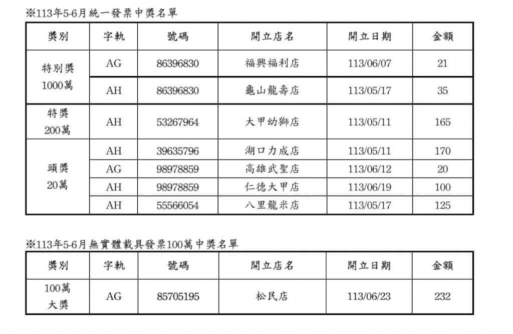 根據《中央社》報導,開出1,000萬大獎的全家門市分別是「彰化福興福利店」和「桃園龜山龍壽店」,兩位幸運兒都花不到50塊,買個咖啡和茶飲就能抱走大獎。台中也有幸運兒,在「大甲幼獅店」花165元買咖啡等商品,幸運中200萬特獎。