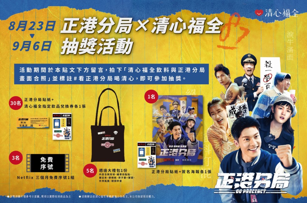 紙杯上可以看到《正港分局》演員現身,共有明「茶」秋毫以及「茶」科打「混」兩種版本,杯款數量有限,送完為止。即日起至9/6,只要分別在「清心福全」與「正港分局」臉書官方粉專按讚,再到清心福全的活動貼文留言處,上傳飲品與劇集畫面合照,標註「#看正港分局喝清心」,即可參加抽獎,禮物包括劇集週邊大禮包、Netflix 三個月免費序號、《正港分局》演員簽名海報與貼紙等,歡迎劇迷們一起來參與!