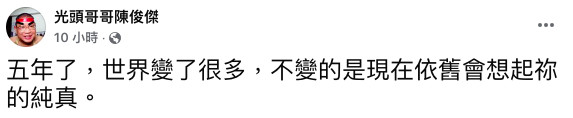 沒想到,11月13日深夜,「光頭哥哥」的小編突然PO出24字相當感傷的內容,「五年了,世界變了很多,不變的是現在依舊會想起祢的純真。」