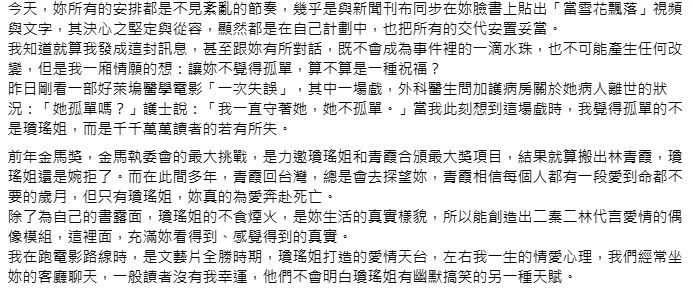 不過高愛倫回想起瓊瑤在11月26日以《憶亡夫》為題發表的一篇長文,雖然文字一如往昔優美,但總能讀出裡頭蘊藏哀傷,她當時就隱約覺得不對勁,除了文中有「不如歸去」4字外,一生追求完美的瓊瑤,竟反常PO出平鑫濤病後形容枯槁的照片,貼文中甚至標籤附註「等我」、「內容明日更新」。