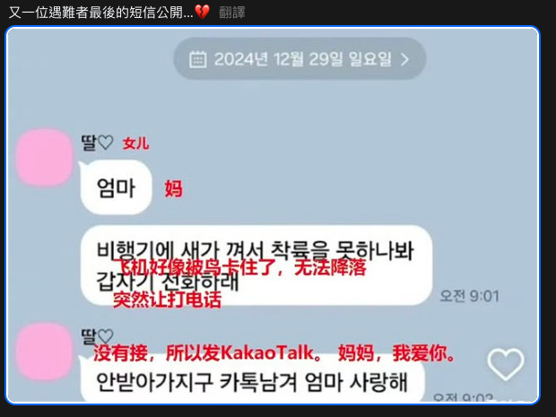 根據《紐西斯通訊社》、《韓聯社》報導,墜機消息曝光後,有網友在南韓網路論壇以「另一名乘客的訊息」為題發文,曬出一張通訊軟體的截圖,只見對方的暱稱為「女兒♡」,傳來「媽,飛機好像被鳥卡住,突然叫我們打電話。沒有接,所以傳Kakao Talk。媽媽,我愛妳……【更多內容請見下方延伸閱讀】