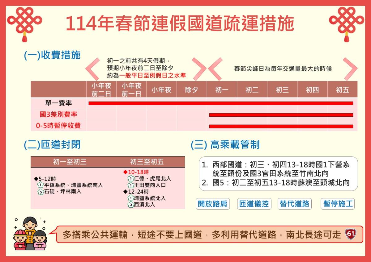 根據媒體《東森新聞》、《風傳媒》的報導,高公局就為此提醒,今年春節連假長達9天,且初五即為假期結束,北返預計初三至初五是最壅塞的時段。為了避免困擾,民眾開車應儘量避開高峰期,若一定要使用國道,建議南部地區用路人於9時前出發,中部地區用路人於12時前出發,或是改搭乘公共運輸工具也是不錯的選擇。
