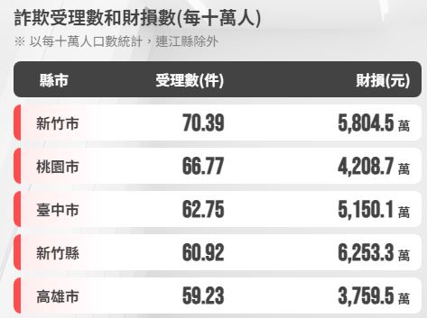 論平均受理件數,第2到第5多的為桃園市、台中市、新竹縣及高雄市;每十萬人平均財損金額最高的則是新竹縣6,253.3 萬元。若是看詐欺案受理總數和總財損數的話,最多人被詐騙的縣市為新北市,1月共受理2,297件、財損達18億4,977.7萬元。