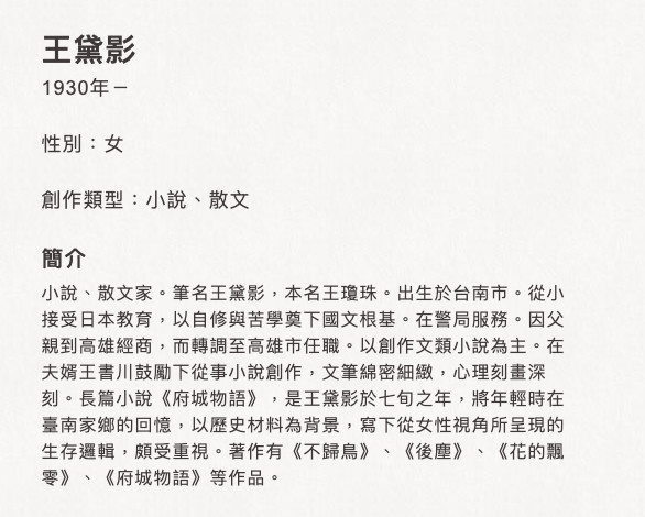 1999年,王黛影以近70歲高齡,撰寫以故鄉台南為背景的長篇小說「府城物語」,透過性格堅韌的女性角色,帶領讀者走過二次大戰前後政權與社會的變遷,是少數以女性為主體的台灣大河小說。