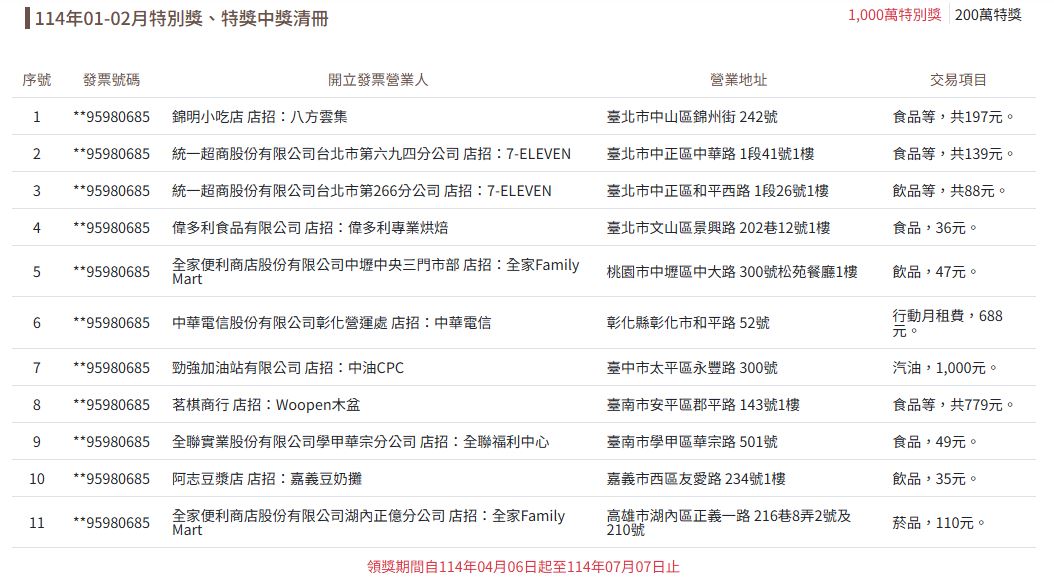 另外提醒,不管大獎還是小獎,114年1-2月期中獎統一發票領獎期限為114年4月6日至114年7月7日,大家可要把握時間兌獎。