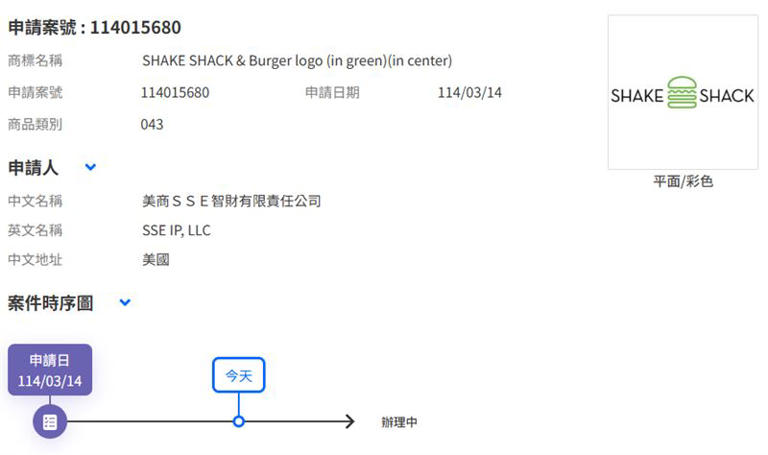 根據媒體《ETtoday新聞雲》、《三立新聞網》的報導,有網友在社群平台Threads上分享驚人發現,Shake Shack在2025年3月14日於台灣提交商標申請,而實際查詢商標檢索系統,Shake Shack是用「SHAKE SHACK & Burger logo(in green)(in center)」名稱申請商標,且已經有申請案號,服務類別為「餐廳服務」,申請人則為「美商SSE智財有限責任公司」,該案目前仍在審查階段。