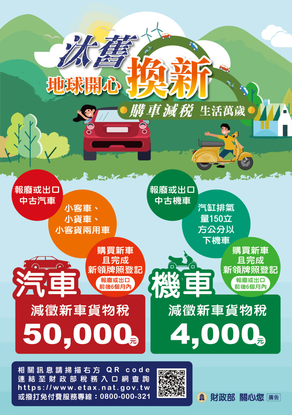 根據媒體《中時新聞網》、《TVBS》的報導,財政部「汰換舊車購買新車減徵貨物稅」計畫宣布延長至2026年1月7日,全台各縣市都能申請,換新車最高可減徵5萬元,機車換新也有減徵4000元優惠,只要等稽徵機關審核申請完成,就會將錢退稅給車商並轉交給車主。