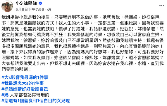5月9日,小S突然在臉書發出長文,向姐姐喊話「珊,接下來我得真的振作起來了!因為媽媽真的好想妳,我也好想妳,可是我要好好照顧媽媽,如果我沒做到,妳應該又會說『徐熙娣,妳都幾歲了,還不會照顧媽媽?』」並坦言「大家都跟我說要走出去,但我不想走去哪裡,因為妳會永遠在我心裡,永遠,直到我們見面的那刻!」令人動容。