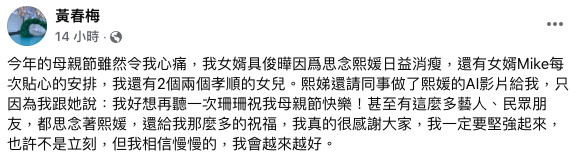 再來,S媽更上傳全家幫自己過母親節團圓照,表示今年的母親節雖然心痛,具俊曄也因思念大S、日益消瘦,但有女婿Mike貼心的安排,還有兩個孝順的女兒,其中小S還請同事做了大女兒的AI影片,只因為自己說「我好想再聽一次珊珊祝我母親節快樂!」