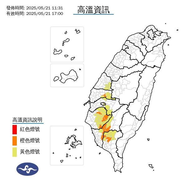 根据媒体《中时新闻网》、《中央广播电台》的报导,中央气象署指出,今 (21) 日至周五 (23),各地大多为多云到晴的好天气,仅大台北、宜花地区及各山区要留意午后雷阵雨,且山区有较大雨势发生机率。另外,全台高温皆能达到30度以上,感受闷热,提醒外出活动要注意防晒并多补充水分。