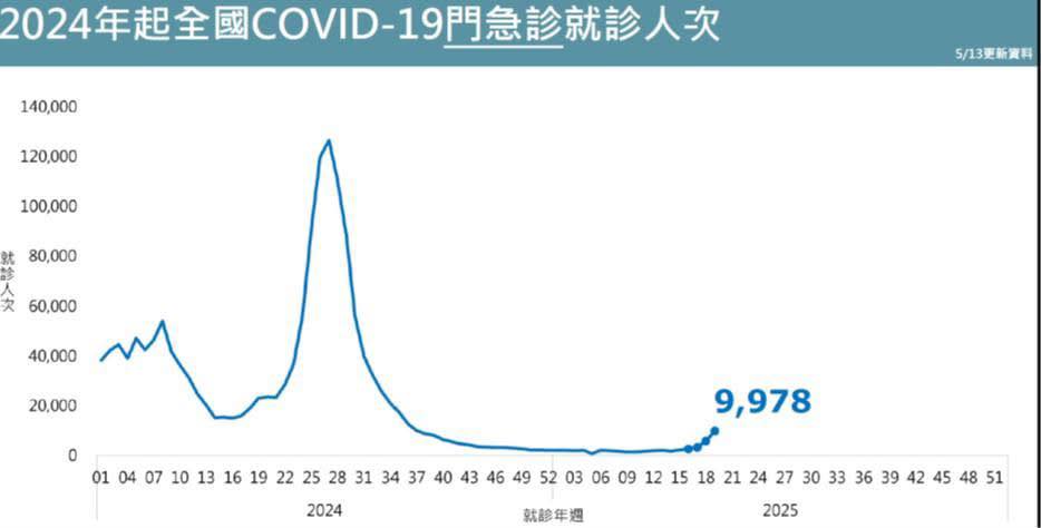 吳昌騰在貼文開頭直呼「新冠病毒再來了嗎?」並表示新變異株NB.1.8.1是主流,當前新冠疫情再度升溫,根據最新資料顯示,台灣自4月中以來,已連續5週出現病例上升的趨勢,上週因COVID-19相關症狀前往就診的人數高達9978人次,較前一週暴增66%,其中以5至19歲的兒童及青少年增幅最為明顯。