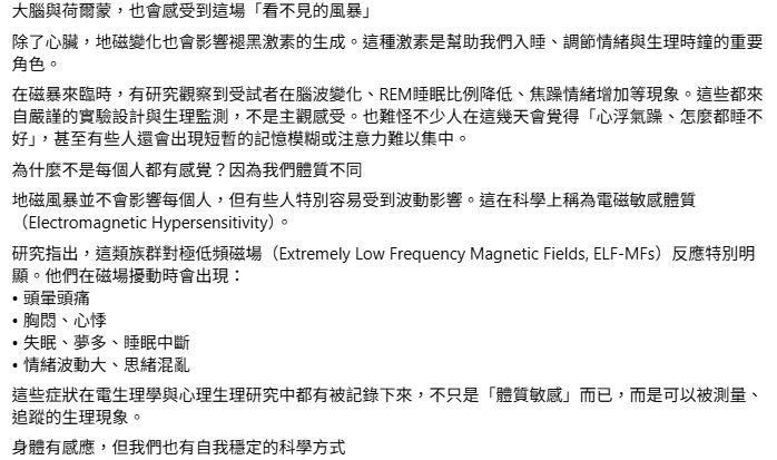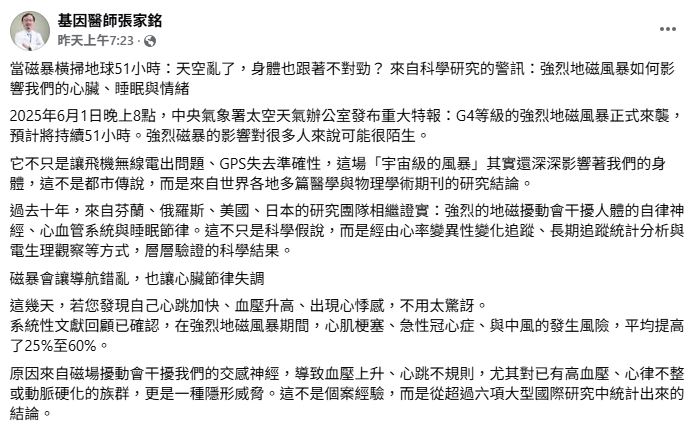 基因醫師張家銘在臉書粉專分享表示,芬蘭、俄羅斯、美國、日本的研究團隊已經相繼證實,強烈的地磁擾動會干擾人體的自律神經、心血管系統與睡眠節律,民眾若在這段期間出現心跳加快、血壓升高、心悸等情形不用太驚訝,正是太空磁爆影響的結果。