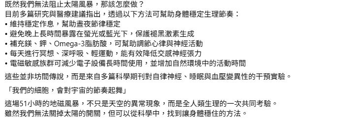 不過地磁風暴並不會每個人都會受影響,還是得看個人體質,「電磁敏感體質」的族群可以透過穩定作息、補充鎂、鉀、Omega-3、呼吸冥想、輕運動、減少長時間使用電子設備來穩定磁暴期間的生理節奏。