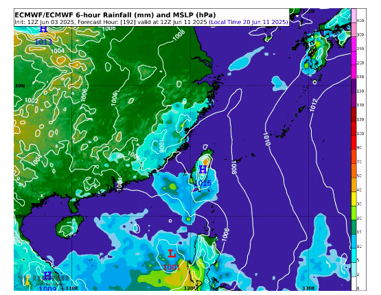 比較值得注意的是,吳聖宇強調,隨著太平洋高壓增強,高壓邊緣的東南風跟位於南海的西南季風交會後,逐漸在南海到菲律賓一帶形成季風低壓槽,模式預報資料認為在這個季風低壓槽中可能會有熱帶擾動醞釀、發展的機會,所以下週的中後期,可能要注意是否有擾動在南海到菲律賓一帶逐漸形成且增強,但預報時間還很久,有待持續觀察。