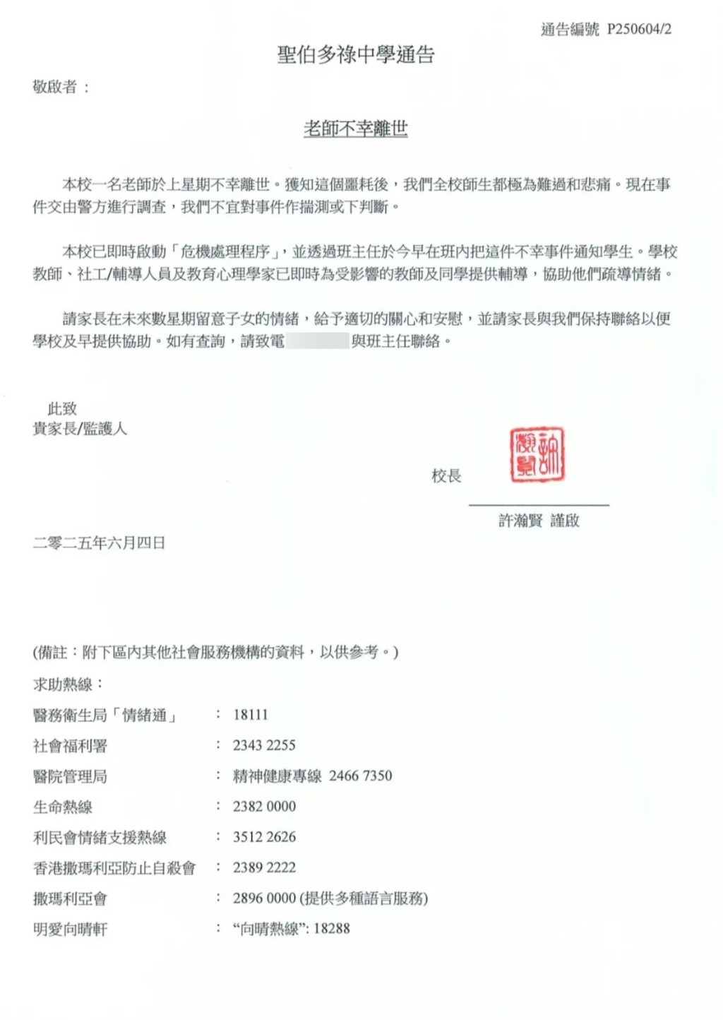 根據媒體《香港01》、《東森新聞》的報導,5月31日,香港警方接獲鴨脷洲海怡半島有人從大樓窗邊墜樓,警消人員趕到現場,發現一名男子已當場死亡,事後確認死者身分為聖伯多祿中學任教的42歲葉姓教師。